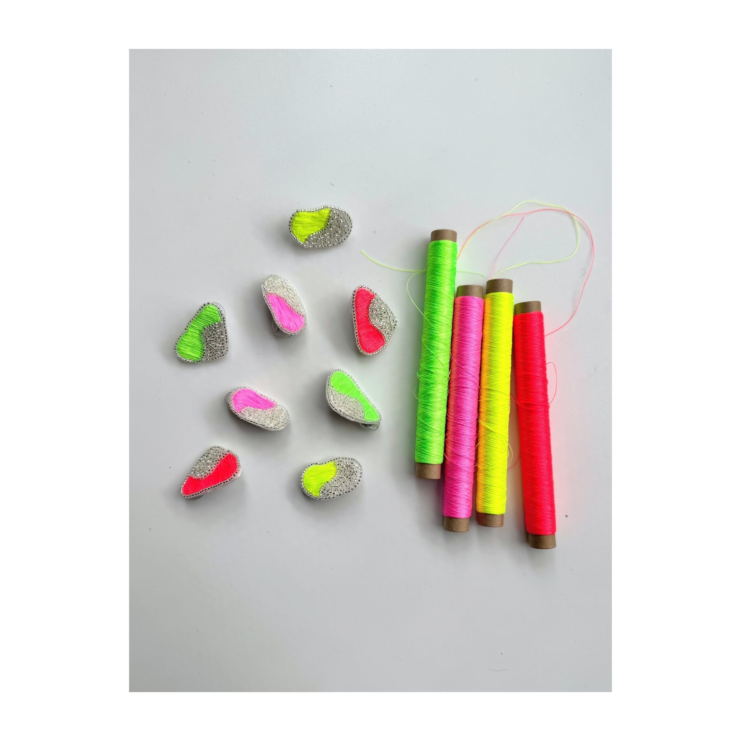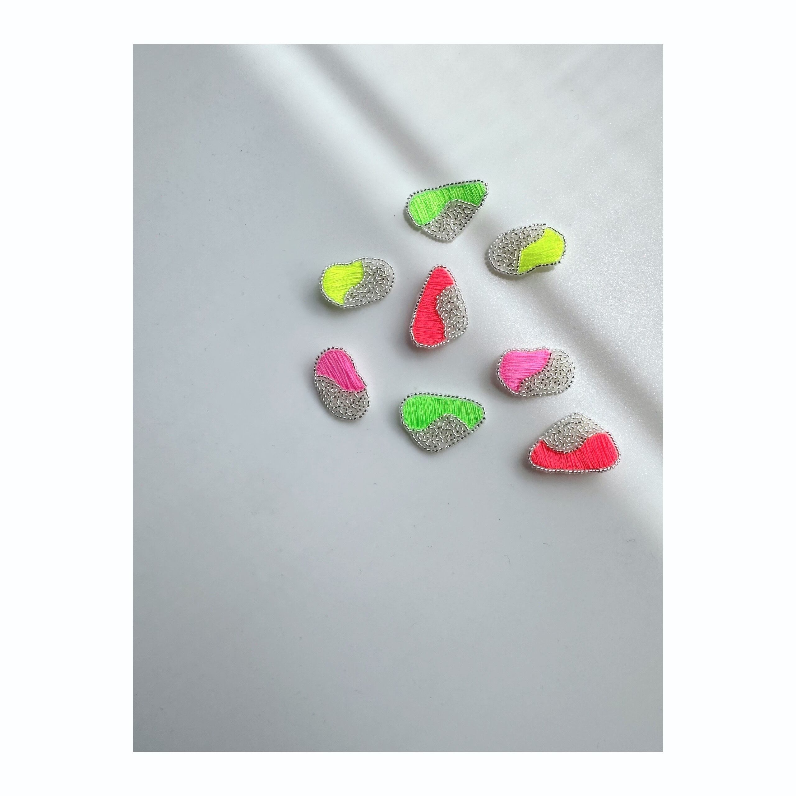 ネオンカラーの糸を使用し、シーグラスをイメージした形状が特徴の魅力的なアイテムです。