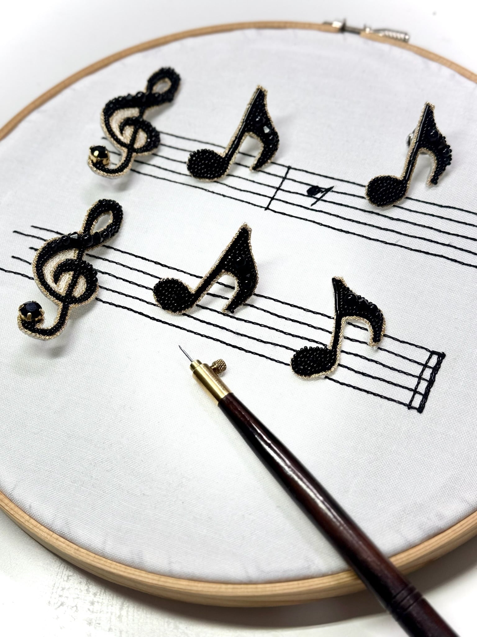 ト音記号と8分音符を組み合わせた魅力的なブローチです。音楽を愛するあなたのコーディネートに、華やかで遊び心あふれるアクセントをプラスします。特別な日やカジュアルな装いにもぴったりなアイテムとして、あなたのファッションにリズミカルな魅力を添える存在となるでしょう!